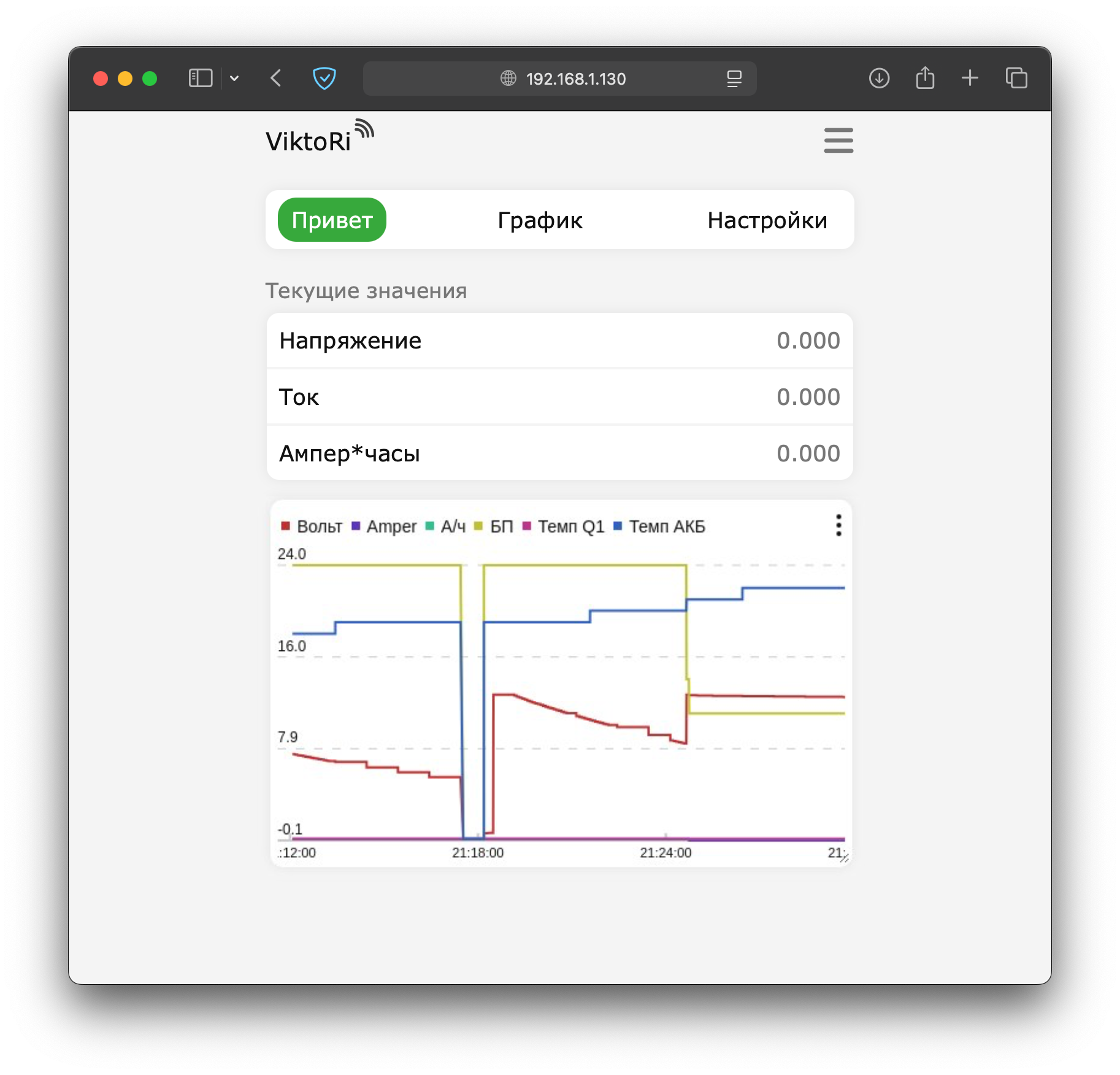 - Привет – текущие значения (напряжение, ток, А·ч) и running-график с шестью каналами: напряжение, ток, А·ч, напряжение БП, температура Q1, температура АКБ